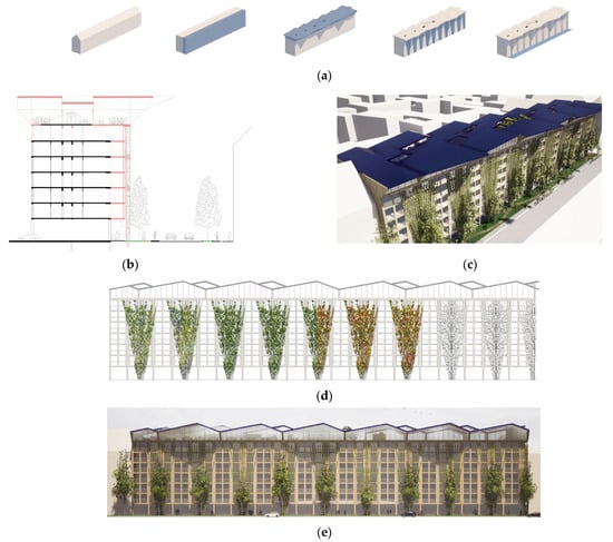 Final ‘Under the city roofs’ design: (a) Development steps of the design concept ‘Under the city roofs’; (b) Sectional drawing; (c) Rendering of the final design; (d) Seasonal variation of vegetated façades; (e) View of Augustenstrasse.