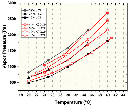 Vapor pressure comparison between LiCl and KCOOH solutions.