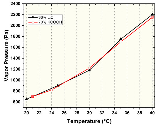 As shown in Figure 3, the vapor pressure of 70% KCOOH and 36% LiCl solutions rose from 699 to 2151 Pa and 651 to 2283 Pa, respectively, when the temperature increased from 20 to 40 °C. Consequently, at the given temperature range, the vapor pressure of these two liquids was the same, which accounted for the driving force for the dehumidification performance [40,41]. The performance of two liquids was compared in the following experiments.