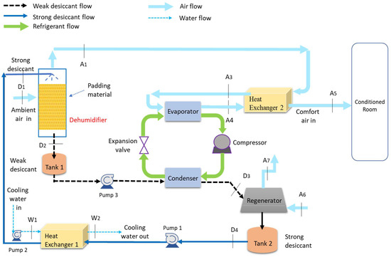 Humans spend nearly 90% of their lifetime in buildings, so it is essential to provide occupants with acceptable indoor environmental conditions. There are several evaluation factors for interior environments, where the indoor temperature and humidity level are the two most critical parameters [1]. The VCR systems consume the majority of power during the peak summer hours of daylight, particularly in regions with hot and humid climates. Globally, ACs based on a VCR system control the indoor building’s environment by removing sensible and latent loads. According to the Brookings India study, the consumption of energy by the AC from total business power consumption will grow from 50% currently to 75% by 2030 [2,3]. As a result, it was criticized for its poor humidity management and high reliance on electricity [4,5]. The same report forecasts that by 2030 the share of power usage for household comfort will rise from present day 7% to 45%. In the past few years, the concept of LDAC has proven to be a more viable alternative to standalone VCR systems as the latent heat load is governed by environmentally friendly liquid desiccant dehumidification technology, which is hygroscopic and can employ renewable energy [6]. In past experiments, various forms of renewable energy have been used to power the LDAC system. LDAC system technology markedly attracted researchers because (a) renewable or waste heat can be employed to regenerate the desiccant solution, (b) the desiccant can be used as heat exchanging media, as it can be precooled or preheated in the cooling system, (c) the dehumidification performance of LDAC system is very good, and (d) microbial contamination, as bacteria can be resisted [7].
