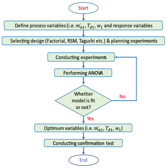 DOE, a statistical technique, is used to analyze input (predicted) and output (response) variables, and different interactions that may be possible between the input variables in all feasible combinations (Design of Experiments for Engineers and Scientists—Jiju Antony—Google Books, n.d.). The general structure for conducting experiments with DOE methodology is shown in Figure 5 [46,47,48,49,50].