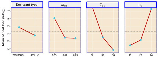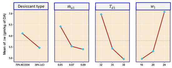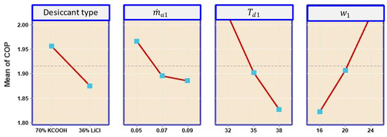 The main effect plot for the is shown in Figure 9. The trend of all four factors for response behave like , as these responses were proportional to each other. Figure 9 shows that the 70% KCOOH solution significantly impacted as compared to 36% LiCl solution. Furthermore, while increasing the and , there was a significant decrease in , but after 0.07 kg/sec, an approximately constant trend could be seen from . However, as increased, increased. The dominating factor for was , as the curve had a steeper trend. Furthermore, the significant values for could be observed from the ANOVA table are as follows: