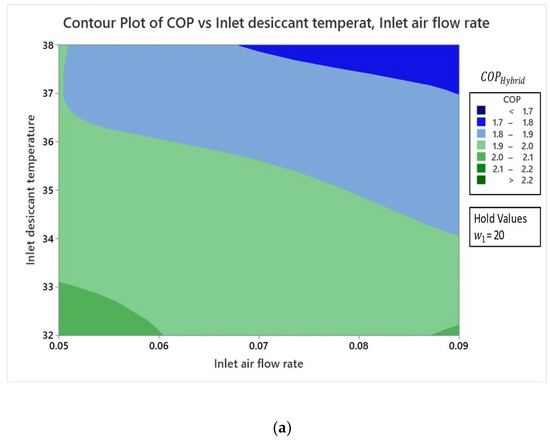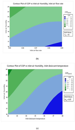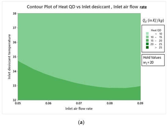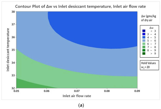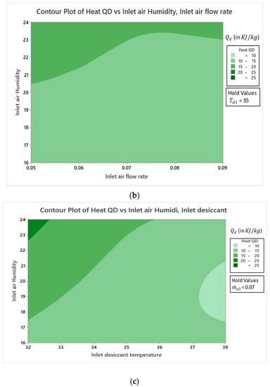 Figure 8 illustrates the contour (interaction) plots of the interaction effect by maintaining one component constant (at a moderate level) and changing the other two. Figure 8a depicts the interaction between and at constant , with the darkest green region exhibiting the greatest response (>9 g/kg of dry air) when both variables were at their minimal values. Furthermore, when these two variables increased, the response began to decrease. From this, we can conclude that the lower values of factors were suggestive to obtain a high value of the response. Figure 8b indicates the interaction between and at constant in which a higher response was observed (>9 g/kg of dry air) at higher and lower value of . Figure 8c shows the interaction between and at a constant value of , which indicates that the lowest values of both factors yielded the maximal response. Additionally, at constant , the response was more sensitive to inlet air humidity compare to inlet desiccant temperature.