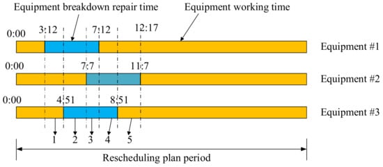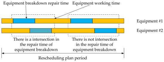 When the breakdown repair time of each piece of equipment intersects on the timeline, the breakdown time is divided into multiple rescheduling periods. This is done by taking the crossing point between the breakdown time of each piece of equipment and the time when the breakdown occurs and maintenance ends. Then, the inserting rescheduling plan preparation is implemented within each rescheduling period. When the breakdown repair time of each piece of equipment does not intersect on the timeline, all subsequent periods are divided into multiple complete rescheduling periods starting from the moment of the first breakdown. This is done when the equipment is characterized by the first breakdown within the daily planning period. In such instances, the complete rescheduling plan is prepared within each rescheduling period (Figure 1).