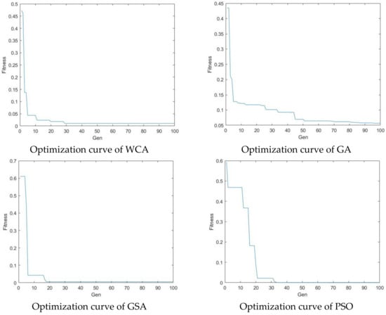 The performance of the wolf colony algorithm is compared with the particle swarm optimization (PSO), the genetic algorithm (GA), and the gravitational search algorithm (GSA). The method is to optimize and solve Formula (11), the range of variable is [–10, 10], and the theoretical minimum value is 0. The optimal fitness value of each generation will deviate in every algorithm due to the randomness of the initial population. The fitness value can be ignored when analyzing the performance of each algorithm. Compared with other algorithms, the wolf colony algorithm converges faster in the early stage, and after the convergence, the variation of the curve is relatively smooth (Figure 2).