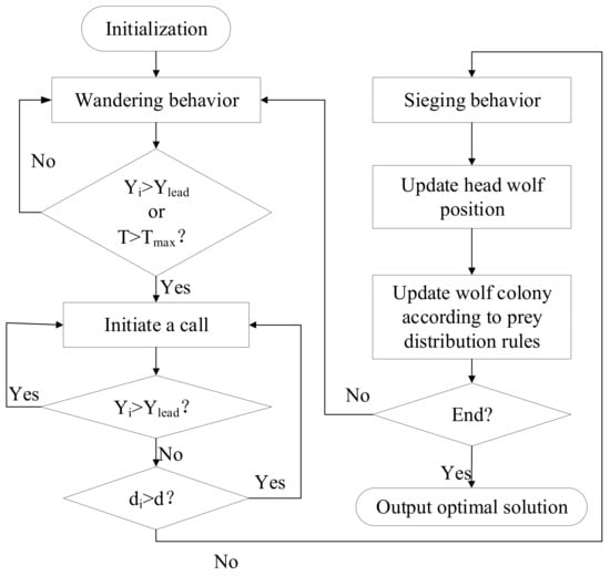 Since the objective function is not unique, and primary as well as secondary goals exist, the first fitness value of each artificial wolf in the solution space is compared against the head wolf rules. If there are multiple artificial wolves with the optimal first fitness values, the second fitness value is compared. If multiple equal second fitness values are present, one artificial wolf is randomly selected as the head wolf among all artificial wolves with equal first and second fitness values. The head wolf does not execute three intelligent behaviors. Moreover, it directly enters the next iteration.