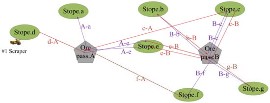 The grades of the stopes currently being mined within a mine using the caving method are shown in Table 1. The loaded and empty running hours of the scraper between the stope and ore pass are shown in Table 2 and Table 3. Part of the original scheduling plan tasks of each scraper on a certain day are shown in Table 4, in which lowercase letters indicate the number of stopes, and capital letters indicate the number of ore passes. For example, “cAd” means that the scraper hauls ore from “c” stope to “A” ore pass, and then drives to “d” stope for the next loading. During a certain production period, there are 7 stopes, 2 ore passes, and 3 scrapers in this sublevel. The equipment capacity of the scraper is 5 t, the full bucket coefficient is 0.95, and the ore block dispersion is 0.83. A simple demonstration of the running route of the #1 scraper at a certain time is shown in Figure 6.