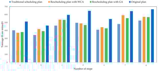 The rescheduling plan calculated by the optimization algorithm is compared with the traditional breakdown scheduling plan (Figure 8). The total ore tonnage of each stope in the rescheduling plan with WCA is higher than that of the traditional scheduling plan and the rescheduling plan with GA. It should be mentioned that the ore tonnage of some stopes in the rescheduling plan is lower than that of the traditional scheduling plan. According to Table 14, the tonnage of ore finally hauled to the ore pass in the rescheduling plan is higher than the ore tonnage of the traditional scheduling plan. Compared to the traditional scheduling plan, the rescheduling plan with WCA has a higher completion rate of 83.40%, which is higher than that of the rescheduling plan with GA, while the ore grade is increased by 0.74%.