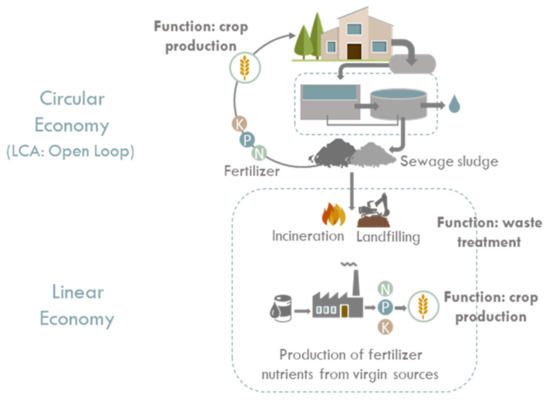 Most waste LCA applications use a functional unit (FU) measured in terms of the waste to be treated, for instance, 1 ton of municipal waste or 1000 cubic meters of wastewater. Thus, the function is to ‘treat waste’. When CE is streamlined, the intended function of waste is to be a prevalent resource for another intended function, for example, producing 1 ton of fodder or 1000 cubic meters of water for potable use (see Figure 1). To illustrate the difference, consider the case of recovering fertilizer nutrients from treated wastewater sludge (TWS) for agricultural reuse [15]. Instead of focusing on the wastewater treatment plant and then expanding the system to account for the saved fertilizer, we propose using the FU and the scope to the function of acres of fodder grown through this second life and then measuring the extent of the ‘lost opportunity’ in the available TWS that could have been safely utilized and instead was landfilled or incinerated. In this context, the opportunity cost is the cost of wasting waste. We argue that the latter better streamlines CE in LCA applications and promotes better utilization of waste by design.