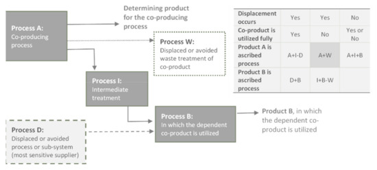 To illustrate our case, we present an analysis of Weidema’s [49] hypothetical example (see Figure 2). Weidema [49] provides different scenarios to show how allocation can be avoided and replaced by system expansion and delimitation in relation to co-production. Coproduct A could have one or more coproducts, which can be utilized in subsequent products (Product B) after possibly receiving intermediate treatment (treatment I); then, Coproduct A could displace other products in the market and prevent their associated processes (process D).