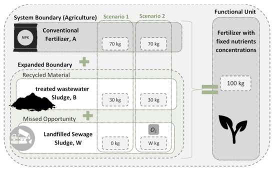 Let W be the amount of wastewater sludge (in kilograms) to be landfilled. Then, as shown in Figure 4, the required fertilizer will be produced entirely from conventional sources (FU = A). The missed opportunity expansion assumes that some wastewater sludge is produced regardless of reuse intention. In our proposal, we further stretch the expanded system boundary to include W. The reference flow of conventionally produced sludge must include what is landfilled and wasted, hence the missed opportunity due to wasted waste. Thus, the reference flow for this scenario should equal 130 kg (see Figure 4). In reality. The amount W is more than 30 kg depending on the nutrient efficiency of the sludge compared to that of conventional fertilizer.