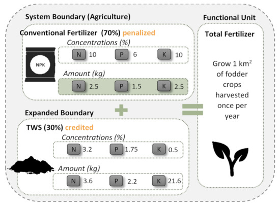 For the sake of illustration, consider a hypothetical LCA problem where the goal is to assess the utilization of TWS to complement conventional fertilizer in agricultural activities and to contrast the result with the business-as-usual scenario, which is landfilling, to improve this activity from a CE perspective [15].