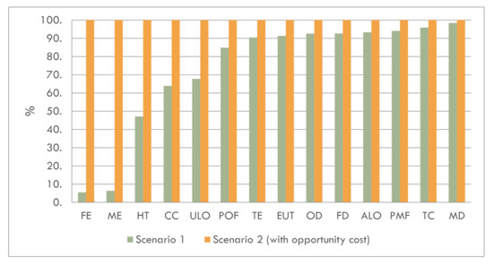 Figure 7 depicts the characteristic results for both scenarios sorted by the largest differences. As expected, Scenario Two has a higher adverse environmental impact due to the additional burden imposed by the opportunity cost (see Table 1). However, the largest difference appears to be in the impact on FE, ME, HT, and CC. The analysis per substance indicates that the cause of this difference is a waste of the metals required for N production, which are mainly copper, nickel, zinc, and manganese [15] plus heavy metals that are leached from landfilled sludge [65,66].