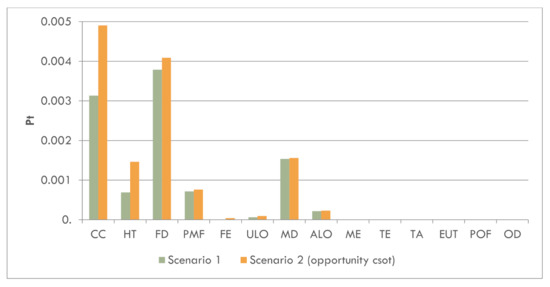 To further investigate the impact of opportunity cost, we apply the paired t test to the difference between the characteristic results of Scenario One () and Scenario Two (). The null hypothesis tests for equality in the mean characteristic results, , and the alternative hypothesis asserts the contrary, that , where indicates the different impact categories. We typically reject H0 if the test statistic , where . Hence, for the 17 impact categories, the resultant = 0.008, which means we reject the null hypothesis and conclude that the opportunity cost made a difference at the indicated level of significance. The 95% confidence interval for the difference in means is .