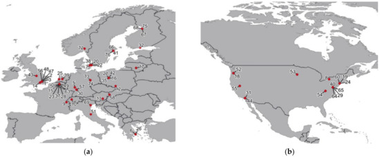 Since it is difficult to see all the European publications and publications from the USA, they are additionally presented in Figure 2 in more detail. Furthermore, there are no publications found in the rest of the world, except in Australia, Thailand, and Jordan, which indicates a lack of research related to NRMM globally.