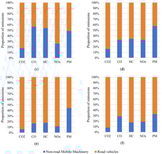 Proportions of NRMM and road vehicle emissions in inventories of: (a) Netherlands; (b) Sweden; (c) Finland; (d) Denmark; (e) Germany; (f) Switzerland.