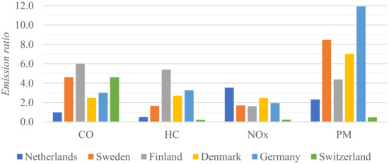 NRMM and road vehicle emissions for Finland, Denmark, Germany, Switzerland, the Netherlands, and Sweden [30,31,33,34,35,36,54,56,57,58].