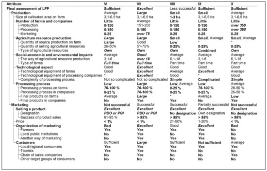 After getting results for the independent variables, the next process was converting the already known qualitative data of dependent variables (y) from the DEX model into quantitative data. Final assessments of local food products (taken from [6]—Figure 1 and Figure 2) present the dependent variables. Assessments were converted from descriptive estimations into quantitative (also numerical) data, which were used in econometric modeling in this survey. For example, the assessments of “marketing system” in the DEX model can get three different ratings (“successful, partial successful and not successful”); they were converted into quantitative numerical values used for econometric modelling purposes (values from 1 to 3) (Table 2).