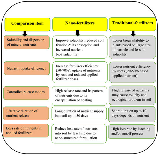 A comparison between traditional fertilizers and nanofertilizers. Sources: from Seleiman et al. [22], Kalwani et al. [42], Belal and El-Ramady [43], and Rizwan et al. [44].