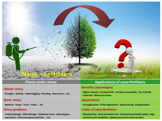 Therefore, this review attempts to highlight nanofertilizers and their impacts on crop production. The effects of the application of nanofertilizers on plants under stressful conditions (i.e., individual, combined, and multiple stresses) are also investigated.
