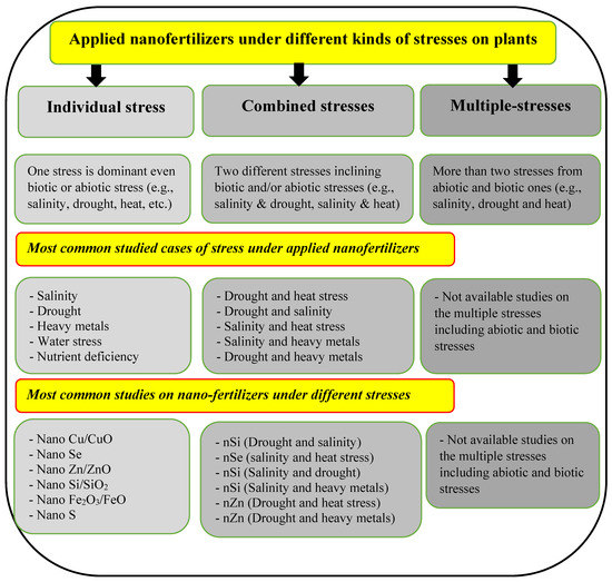A comparison of the common stresses on cultivated plants, including individual, combined, and multiple stresses, and the role of applied nanofertilizers under such conditions. Numbers refer to the citations in the reference list.