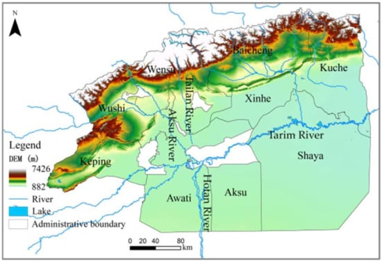 The Aksu region (78°03′–84°07′ E, 39°30′–42°41′ N) is located in the middle of the southern foot of the Tianshan Mountain in Xinjiang Uygur Autonomous Region, China, and the northern edge of the Taklamakan Desert. The administrative area includes Aksu City, Wushi County, Wensu County, Baicheng County, Kuche City, Keping County, Awati County, Xinhe County, and Shaya County. The climate is characterized by dry and cold winters and dry and hot summers. The topography is low in the southeast and high in the northwest (Figure 1). A large area of glacial and permanent snow is distributed in the northern part. The desert and Gobi in the south are widespread, with low vegetation cover, low rainfall, and high evaporation. The Gobi and oasis appear in the central part of the region, and a high consumption and unbalanced use of water and soil resources have aggravated the ecological environment deterioration.
