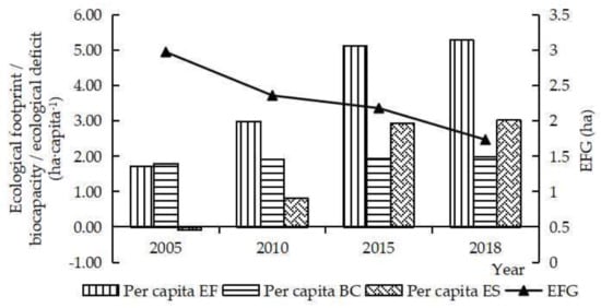 The per capita ecological footprint and per capita biocapacity of the Aksu area increased year by year from 2005 to 2018. The increase in the ecological footprint was significantly higher than that of the biocapacity, resulting in a shift in the region’s ecological balance from surplus to deficit (Figure 2). Meanwhile, the regional per capita GDP increased from CNY 5770 to CNY 30,457; however, the ecological footprint of CNY 10,000 GDP decreased from 2.98 ha to 1.74 ha.