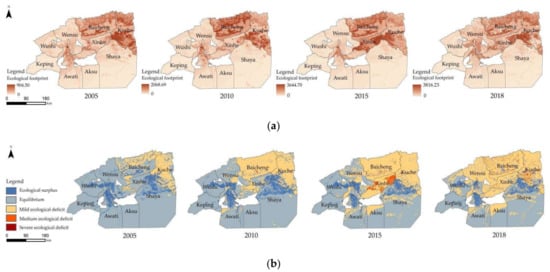 Ecological footprint and ecological deficit in the Aksu region from 2005 to 2018. (a) ecological footprint; (b) ecological deficit.