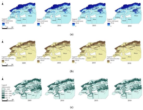 Ecosystem service functions in the Aksu region from 2005 to 2018. (a) water supply function; (b) soil conservation function; (c) habitat quality function.