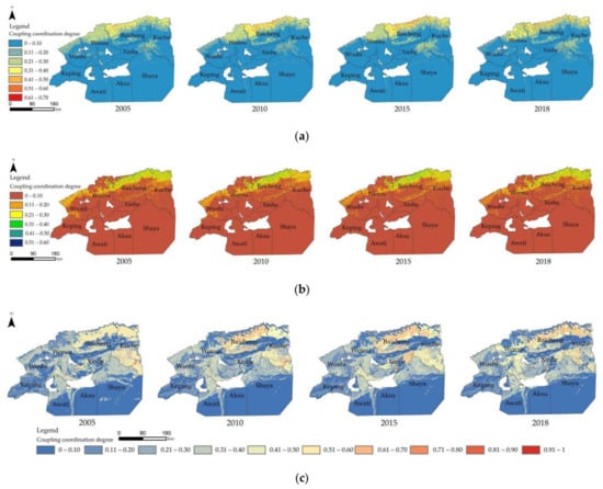 Coupling coordination degree of the ecological footprint and ecosystem service functions in the Aksu region from 2005 to 2018. (a) ecological footprint and water supply of D; (b) ecological footprint and soil conservation of D; (c) ecological footprint and habitat quality of D.