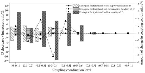 The coupling coordination between the ecological footprint and habitat quality was the strongest in the Aksu region from 2005 to 2018; however, the coupling coordination between the ecological footprint and water supply and soil conservation function was weak. The ecological footprint lagged behind the water supply because of the better ecological quality of the water-conserving area on the southern slope of the Tianshan Mountain, and the ecological footprint gradually increased with an increase in human interference. The proportion of the coupling coordination degree of the ecological footprint and water supply function belonging to [0–0.3] decreased, and that of (0.3–0.6] increased (Figure 6), showing a trend toward coordination; however, the ecological deficit in the region is obvious, and the economic development structure needs to be adjusted. Considering the entire study area, the pressure on the ecological environment has gradually increased with the development of social economics, resulting in the increase in the proportion of the ecological footprint and soil conservation function [0–0.1]. Meanwhile, the other coordination degrees decreased. The coupling coordination degree between the ecological footprint and biodiversity maintenance fluctuated and decreased.