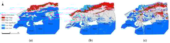 LISA cluster map of the coupling coordination degree between the ecological footprint and ecosystem service functions. (a) ecological footprint and water supply LISA. (b) ecological footprint and soil conservation LISA. (c) ecological footprint and habitat quality LISA.