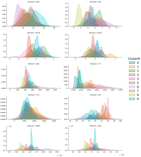 The results of the clustering algorithm are illustrated in Figure 4. The clustering algorithm automatically recognizes the regional characteristics of meteorological factors, topographic features, and NO2 concentrations. Resulting clusters reflect the climatic type distribution and topographic characteristics in China, including Northwest China (cn = 0, cn is the serial number of a cluster), the Yunnan Guizhou Plateau (cn = 1), Northeast China (cn = 2), the Jianghuai Region (cn = 3), the Qinghai–Tibet Plateau (cn = 4), Southeast China (cn = 5), the southeast coastal cluster (cn = 6), the Shanxi–Shaanxi Basin (cn = 7), the Sichuan Basin (cn = 8), and the Huabei Plain (cn = 9). As the clusters are automatically generated by the algorithm, the boundaries of the clusters named above are not strictly consistent with the boundaries of the same geographic name areas. Since there are no clear topographic or meteorological boundaries between the Jianghuai Region and the Huabei Plain, the division between these two clusters is mainly caused by the concentrations of NO2. By removing NO2 from the clustering variables, these two clusters will be combined into one.