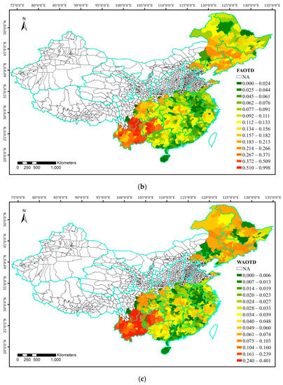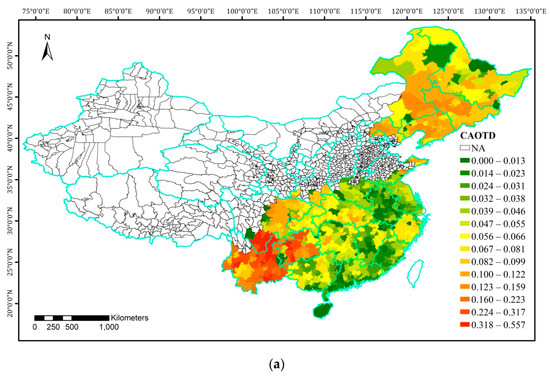 In the calculation of delta AOT40, growing seasons were adjusted according to the vegetation types, resulting in different AOT40 changes for the same county. Hence, Figure 7a–d demonstrate various patterns of distributions. Not all vegetation types are included in Figure 7, such as horticultural vegetation, the distribution of which is similar to that of crops. It was found that additional emission of VOCs induces greater increases in AOT40s in Northeast China and the Yunnan Guizhou Plateau. The growing season of rice is significantly different from the other vegetation types, and this induces relatively large increases in AOT40s in Southeast China.