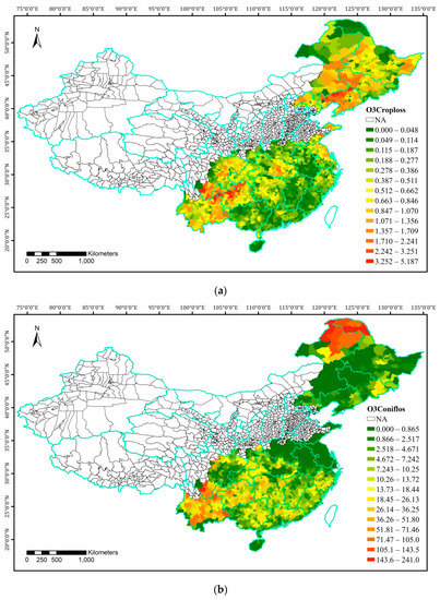 This study identified the counties where emissions of VOCs have significantly positive effects on ozone concentrations. The selected areas shown in Figure 7 and Figure 8 are similar to Cao et al.’s study [4], except that our clusters were automatically generated by the clustering algorithm and selected by the clustering spatial regression, and thus Northeast China was included as a separate region. Our study also identified the counties where large marginal AOT40 changes are created by the same amount of VOC emissions and discerned the counties where marginal yield/biomass losses and marginal economic losses are large due to the marginal emission of VOCs. Usually, these places with large losses have a dense distribution of high-value vegetation, high marginal increases in AOT40s, sensitive yields, and high prices of vegetation products. These county-level marginal loss values could assist in assessing a new project, which may introduce more VOC emissions.