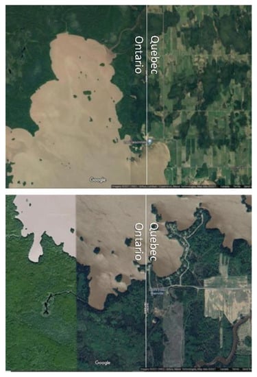 Imagery illustrating ~70 years of unfettered development and environmental assimilation on northern Quebec’s side of the border, whereas relatively little development occurred on northern Ontario’s side near the provincial-boundary line. Northern Ontario was part of Treaty No. 9, 1905 [19], while northern Quebec was not covered by treaty until 1975 [20] (from Tsuji [2]; Top frame from Google Maps Imagery © 2022 CNES/Airbus Landsat/Copernicus, Maxar Technologies, Map data © 2022. Bottom frame from Google Maps Imagery © 2022 CNES/Airbus, Maxar Technologies, Map data © 2022).