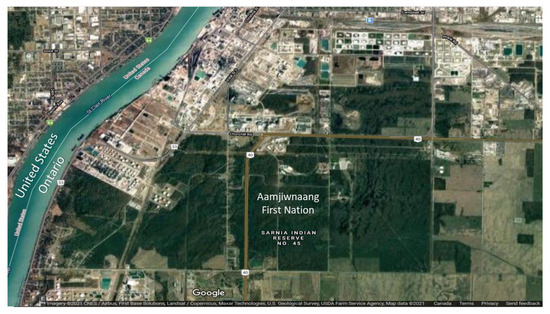 Imagery showing extensive development (e.g., greater than 50 industrial facilities) within a 25 km radius of Aamjiwnaang First Nation in southern Ontario. Aamjiwnaang First Nation is an Indigenous island in a sea of colonial development that significantly impacts their cultural and associated activities (from Tsuji [2]; Google Maps Imagery © 2022 CNES/Airbus, First Base Solutions, Landsat/Copernicus, Maxar Technologies, U.S. Geological Survey, USDA Farm Service Agency Map data © 2022).