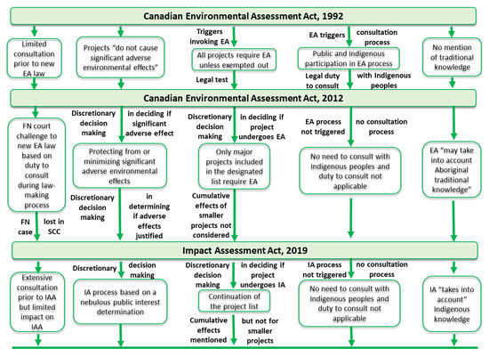 In 2008, the world was plunged into a financial crisis [42]; as noted by several researchers [43,44], governments respond to financial crises by stimulating economic development and creating jobs. Thus, it is not surprising that in 2012, the Government of Canada passed Bill C-38 [45], which contained the new Canadian Environmental Assessment Act, 2012 (hereafter referred to as CEAA, 2012) [26] and Bill C-45 [46]; these omnibus bills fundamentally changed the federal environmental assessment process [39,47,48]. Omnibus bills are considered in their entirety through a single vote [49] and are generally regarded as problematic due to the complexity of the changes made to a number of laws [50]. Bill C-38 [45] and Bill C-45 [46] streamlined the federal environmental assessment process by exempting many projects, which reduced or eliminated opportunities for public consultation as well as consultation opportunities with Indigenous peoples through the environmental assessment process [39,49].