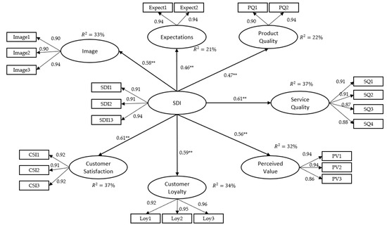 Results from the Customer model show strong internal consistency of the SDI as an independent construct, but also in a combined model with the latent EPSI model variables. There are however valid concerns regarding how strong the relation between an underlying manifest item and its LV should be. Authors such as [