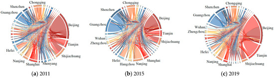 In order to visually present the spatial–temporal disparities in the overall network from 2011 to 2019, we defined four-year intervals, selecting 2011, 2015, and 2019 as the years under investigation (Figure 2). Overall, there are clear differences in node size and connection strength in the network. For example, Beijing, Guangzhou, Shenzhen, Shanghai, Nanjing, and Hefei are the core cities in the urban agglomeration of Beijing–Tianjin–Hebei, the Pearl River Delta, and the Yangtze River Delta, respectively, and these cities are highly connected to other cities. As shown by the arc connections in Figure 2a, in 2011, the relationship in housing investment between Beijing and Shijiazhuang was the largest, followed by those between Guangzhou and Shenzhen and between Tianjin and Shijiazhuang. Figure 2b shows that in 2015, those cities with large intercity housing investment relationships were Beijing and Shijiazhuang, Nanjing and Hefei, and Guangzhou and Shenzhen. Finally, in 2019, as shown by Figure 2c, Beijing, Tianjin, Guangzhou, Shenzhen, Nanjing, and Hefei had large intercity housing investment relationships. Therefore, these results show that the housing investment network is a “rich cities club”.