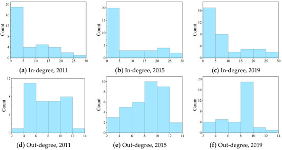 The distributions of the 2011, 2015, and 2019 node degrees for the urban housing investment niche network were used to draw histograms of the out-degree distribution and the in-degree distribution (Figure 4). The peak value of the in-degree distribution was between 0 and 5 in 2011, 2015, and 2019, indicating that the distribution is right-tailed and thus that most cities are unable to attract investment. In 2011, the peak value of the out-degree distribution was between 4 and 6, again indicating a right-tailed distribution. The peak value of the out-degree distributions for 2015 and 2019 were between 8 and 10, suggesting that the right-tailed tendency of the distribution increased. This increase implies that foreign investment is increasing and that there remains little mutual investment between cities. This lack suggests that there is a massive amount of room for growth in the future.