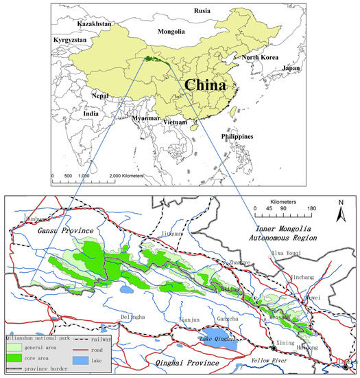 To protect the fragile alpine ecosystem and the endangered wild species inhabiting there, various Chinese governmental departments have established a number of protected areas over the past decades, such as nature reserves, forest parks, wetland parks, and geological parks. These protected areas are usually overlapped, and their administration units are often in conflict. Consequently, the state of nature protection is not satisfying in this region. For example, although mining in a nature reserve is illegal in China, there were around 144 mining sites in Qilianshan National Reserve, which gave rise to severe environmental consequences (such as deforestation and soil erosion) as well as alarming damages to the natural ecosystem in this region. It is just in consideration of its outstanding significance in biology and ecology that a pilot national park is established in this area. In 2017, to thoroughly overcome the internal weakness of the past administration models and to make better and more effective protection of its fragile alpine ecosystem, QNP was designated as one of the ten pilot national parks by the central government of China. It lies in northwestern China’s Gansu Province and Qinghai Province (see Figure 2), which covers an area of around 50,200 square kilometers. It is composed of two parts, i.e., the Gansu section (34,400 square kilometers) and the Qinghai section (15,800 square kilometers). Before it became a pilot national park, there had been eight different protected areas co-existing in this region, including three National Nature Reserves, one National Forest Park, three Provincial Forest Parks, and one National Wetland Park. All of them were created and administrated by different governments.