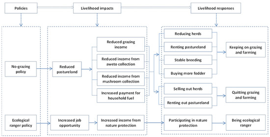 The above analysis shows that QNP has already generated various impacts on the livelihoods of the local residents, particularly those villagers who depend on the natural resources in the park. To more fully distinguish the responses of the local people, we divided them into two groups. The first group includes villagers whose livelihoods heavily depended on the natural resources in the park (particularly pastureland and farmland) in the park and who generated income mainly from grazing or farming. The second group contains villagers who do not primarily earn income from the natural resources in the park. Then, we discussed in detail the strategies they used to cope with regard to each group separately (see Table 4).