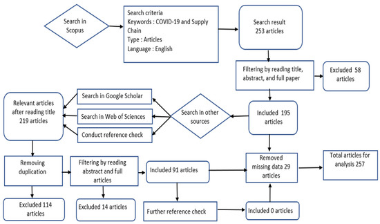 The keyword search was set to include titles, abstracts, and key words in order to retrieve all relevant publications. The initial search yielded nearly 1700 papers but narrowing the results to only the business research area and only English articles yielded 253 articles. We then excluded irrelevant results by reviewing titles, abstracts, and full papers; this process excluded 58 articles, leaving 195 papers from the Scopus database. The inclusion criteria were: (i) articles focused on the supply chain in relation to the COVID-19 pandemic and (ii) the inclusion of both ‘supply chain’ and ‘COVID-19’ in the body text. The exclusion criterion was if keywords only appeared in the reference lists without being discussed in the body of the text.