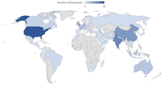 From these data, we summarized the number of papers published on supply chain and COVID-19 from January 2020 to July 2021 based on their country of origin. The intensity of the color represents the number of documents produced by each country. The darker the color, the greater the number of documents. According to Table 3 and Figure 2, the flow of work from the US was obviously the most intense (65 documents, 25.3%), while, surprisingly, India was second (43 documents, 16.7%), followed by the UK (38 documents, 14.8%), and China (35 documents, 13.6%). The US accounted for about a quarter of all the documents in the sample. For the rest, the number of papers contributed on supply chains and COVID-19 comprised fewer than 20 documents for each country. Most of the countries with a high intensity of papers were the countries that also faced more serious situations in regard to COVID-19.