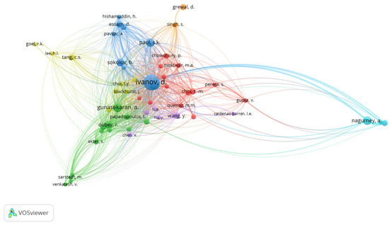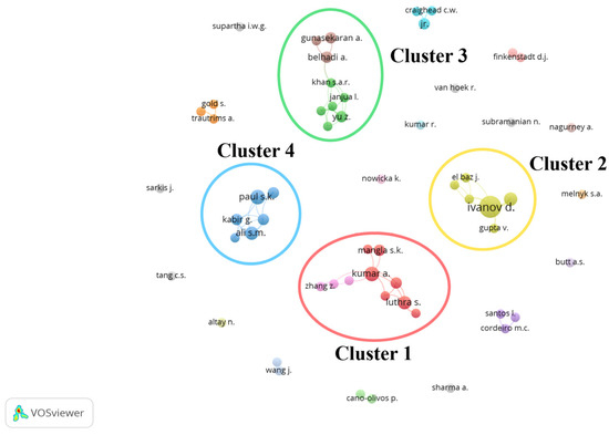The authorship in Cluster 2 is strongly connected with Ivanov, D. as a central node. Other authors in this cluster included Das, A., Ruel, S., El Baz, J., Gupta, V., and Dolgui, A. The area of study in this cooperative group was related to the resilience and viability of supply chains, and Ivanov, D. was the main author in this field. This group of authors initiated the concept of improving supply chain resilience and, at some point, they shifted the concept towards supply viability, which is more focused on adaptability rather than recovery. They conceptualized supply chain resilience in a new normal approach, which they called ‘supply chain viability’, which focused on adaptability to survive and thrive. Some tools to help supply chain decision-making during the difficult times in the COVID-19 pandemic were also introduced, e.g., a digital supply chain twin [8] and a nonlinear programming model [6].