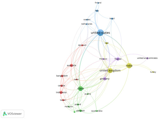 In considering the level of academic contributions by each country, this analysis will provide more insightful implications regarding how documents from each country are connected to one another, regardless of their authorship cooperation. The results of evaluating the cooperation network between countries and territories are presented in Figure 4. Based on the numbers of documents, the top four contributors were the US, the UK, and two countries from Asia, India, and China. The first, or largest, cluster, was centered around the US and mostly consisted of European countries such as Sweden, the Netherlands, Finland, and Italy. There were also two smaller clusters. The second cluster was formed around three countries, namely Germany, France, and Morocco, while the third cluster mostly comprised Asian countries, like Indonesia, Bangladesh, Taiwan, but also included Australia, Denmark, and Canada. The fourth cluster, which formed around the UK, consisted of India, Turkey, and Iran. The fifth cluster was centered around China and included countries such as Pakistan, Poland, Malaysia, Austria, and Saudi Arabia.