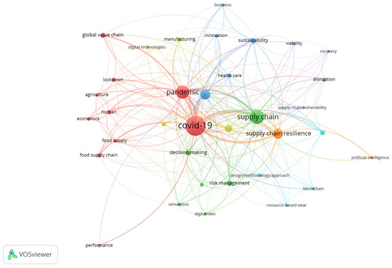As shown in Figure 3, the authorship was centered around Kumar, A. and extends into two subclusters. The first subcluster included Kumar, A., Kumar, P., Mangla, S.K., Sharma, M., Joshi, S., Luthra, S., and Haleem, A. Their main areas of research relate to supply chain vulnerability, resilience in agri-food supply chains, healthcare supply chains during the COVID-19 pandemic, survivability of sustainable supply chains, retail supply chain performance, the internet of things (IoT), and medical supply chains. The second subcluster included Zhang, Z., Srivastava, P.R., and Gupta, S. Papers in this cluster were focused on supply chain resilience, a time delay COVID-19 propagation model, and artificial intelligence (AI) technologies. In conclusion, most of the authors in this cluster have publications in the area of supply chain resilience and vulnerability in agricultural, food, and healthcare supply chains related to implementing AI technologies and IoT during the COVID-19 pandemic. Kumar, A. played the most important role in this area. This cluster showed the extensive amount of work produced by the various authors to improve supply chain resilience during COVID-19 which could be supported by technology, such as AI or IoT. The contexts highlighted within this group were the agriculture industry, which was more vulnerable, and the healthcare industry, which was highly focused on during the pandemic.
