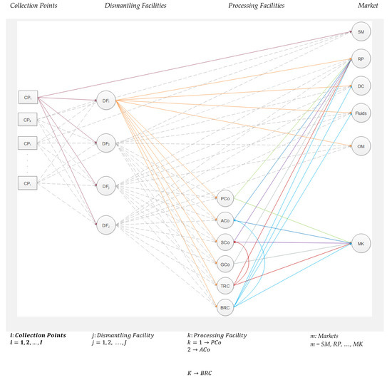 where i denotes the collection points, j the dismantling facilities, k the processing facilities, and m the markets. The index includes plastic company (PCo), aluminum company (ACo), steel company (SCo), glass company (GCo), tire-recycling company (TRC), and battery-recycling company (BARC). The index comprises secondhand market (sh), reusable parts market (rp), disposal center (dc), fluids market (fl), other materials market (ot), and commercialization markets (mk).
