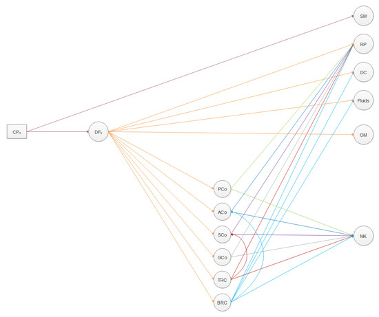 The network is based on material flows exchange from one entity to the other. Figure 1 is illustrated in a geo-spatial format; however, the entities form a network without any location restriction. As presented by [20], material exchanges have five types: type A is waste exchanges through third party; type B is within facility, firm, or organization; type C is between firms collocated in a defined Eco-Industrial Park; type D is between local firms that are not collocated; and type E is between virtually organized firms across a broader region [13,20]. The main types for flows to build an EIP are types C–E [30]. In the proposed network, the material exchanges through different ways of transportation; trucks and pipelines are the main methods. The modeled network is shown in Figure 2. The figure shows the processing pathways going from the collection points (CP1, CP2, …, CPI) to the dismantling and shredding facilities (DF1, DF2, …, DFJ). This is followed by the different processing facilities, such as tire and battery further processing, and finally, the introduction of useful products to market. More details about the different components and nodes of the overall superstructure used in the development of the model are given in Appendix A.